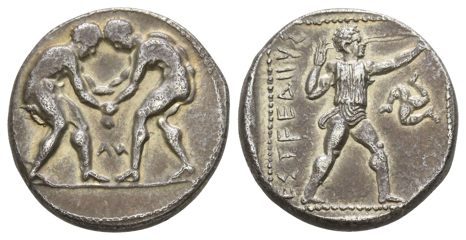 Two wrestlers beginning to grapple with each other, the one on the left grasping his opponent's wrist and upper arm; AͶ between / EΣTFEΔΙΙΥΣ, slinger striding to right, preparing to launch his sling-bolt; clockwise triskeles to right field. SNG BnF 85 var. (AM). 10.84gr, 22mm, 6h.