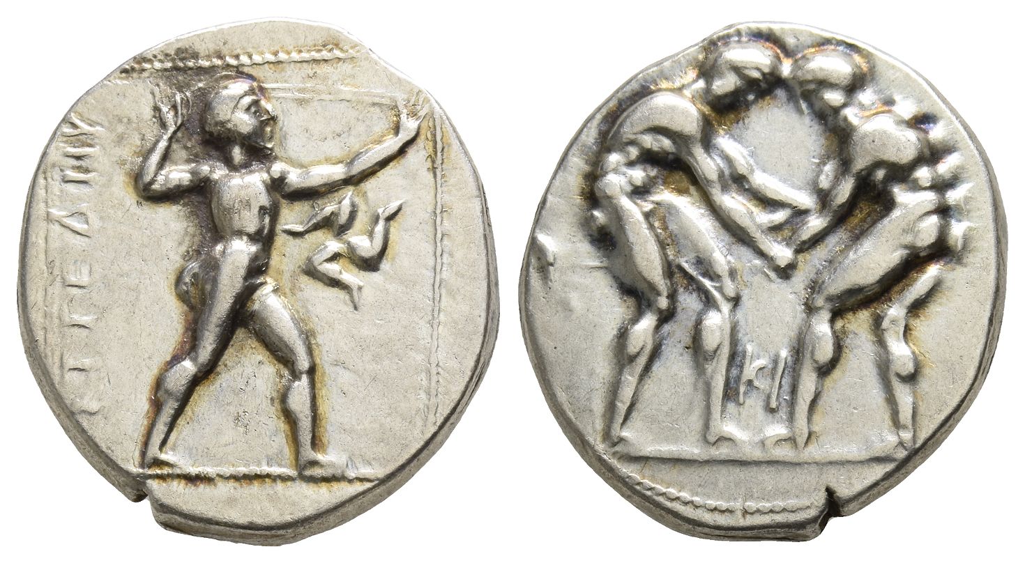 [E]ΣTFEΔIIY[Σ], slinger standing to right, preparing to loose; in field to right, triskeles running anticlockwise; all within dotted square frame / Two wrestlers grappling, KI between. SNG BnF 104; Tekin Series 4. 10.70gr, 23mm, 12h.