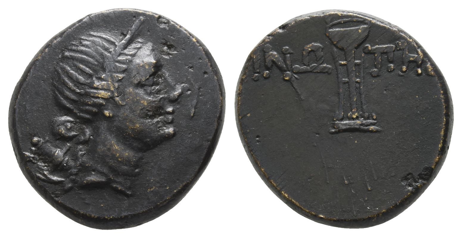 Head of Artemis to right wearing stephane; bow and quiver over shoulder / ΣINΩ-ΠHΣ, tripod-lebes. SNG BM Black Sea 1524; HGC 7, 417. 8.14gr, 20mm, 12h.