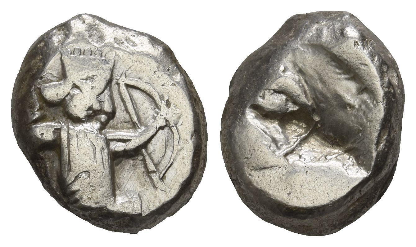 Lydo-Milesian standard. Sardes or subsidiary mint. Type IV (middle) B. Persian king or hero, wearing kidaris and kandys, quiver over shoulder, in kneeling-running stance to right, holding dagger in right hand, bow in left / Oblong incuse punch. Carradice Type IV, Group B; BMC Arabia pl. XXVII, 7. 5.34gr, 15mm.