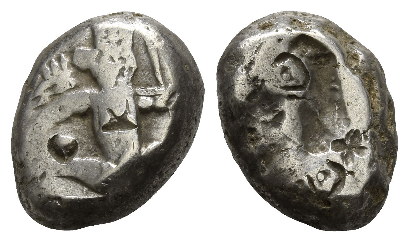Lydo-Milesian standard. Persian king or hero, wearing kidaris and kandys, quiver over shoulder, in kneeling-running stance to right, holding dagger in right hand, bow in left / Oblong incuse punch. Carradice Type IV, Group B; BMC Arabia pl. XXVI, 17. 5.54gr, 16mm.