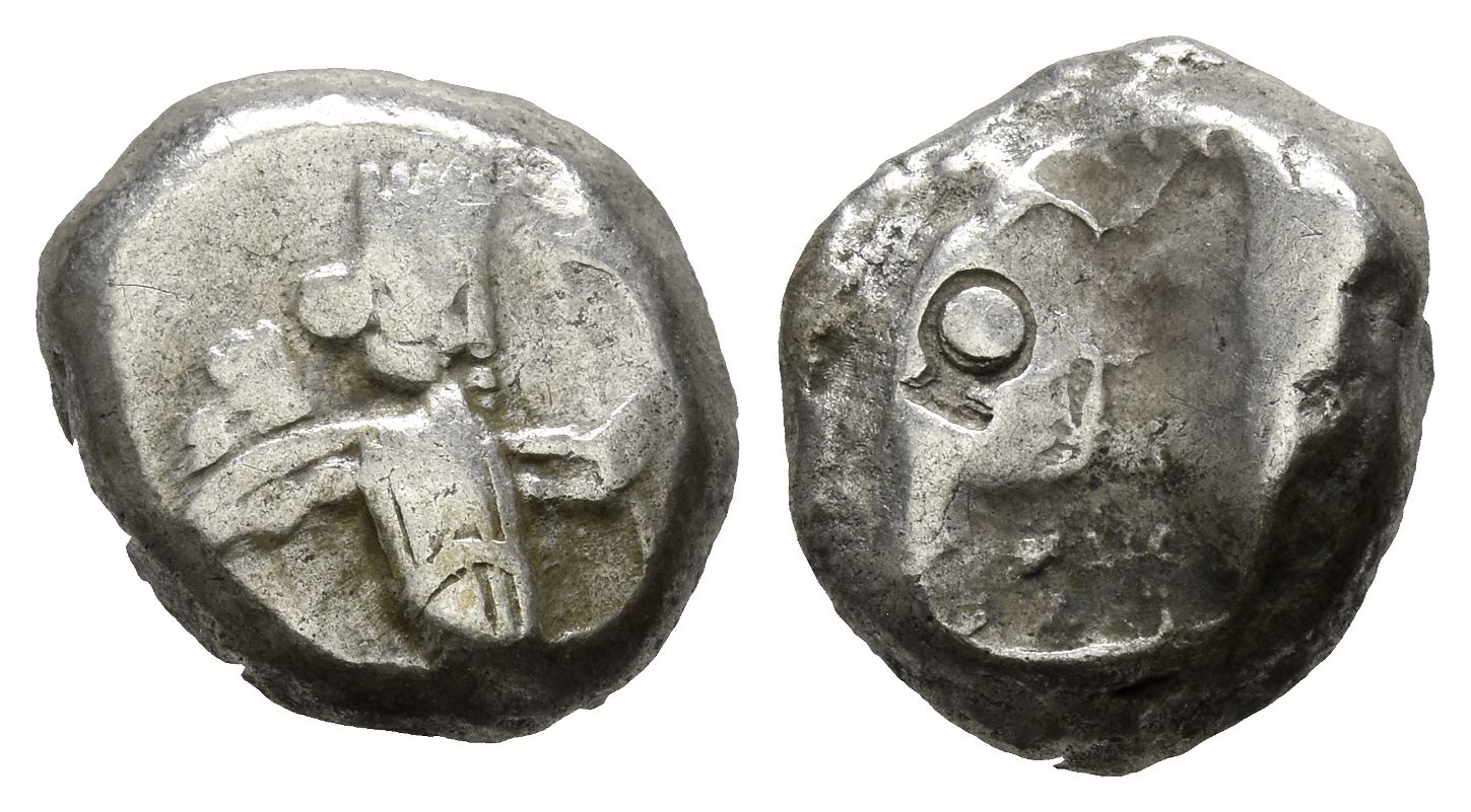 Lydo-Milesian standard. Persian king or hero, wearing kidaris and kandys, quiver over shoulder, in kneeling-running stance to right, holding dagger in right hand, bow in left / Oblong incuse punch. Carradice Type IV, Group B; BMC Arabia pl. XXVI, 17. 5.54gr, 15mm.