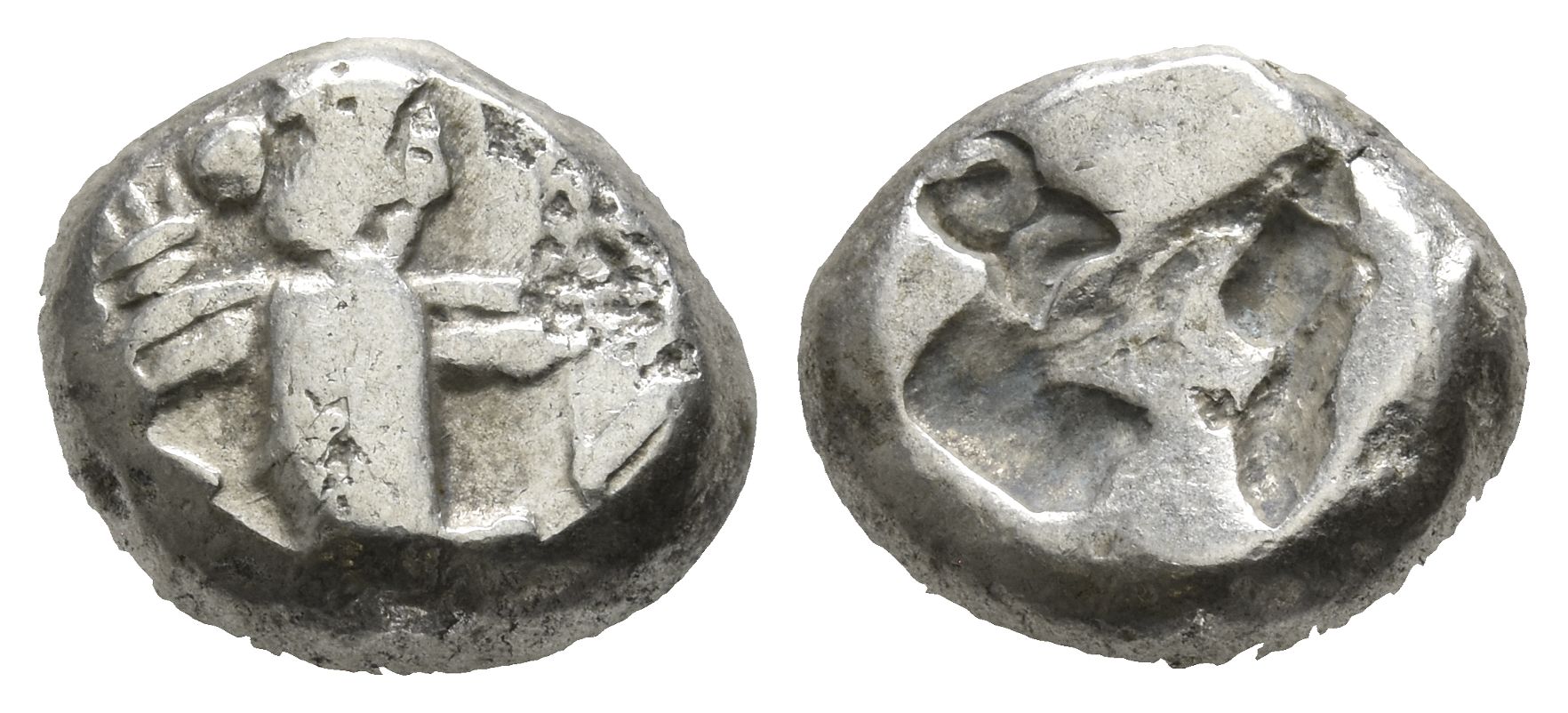 Lydo-Milesian standard. Persian king or hero, wearing kidaris and kandys, quiver over shoulder, in kneeling-running stance to right, holding dagger in right hand, bow in left / Oblong incuse punch. Carradice Type IV, Group B. 5.57gr, 15mm.
