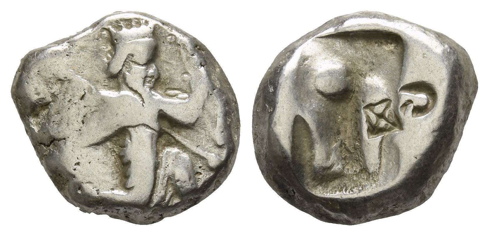 Persian king or hero, wearing kidaris and kandys, quiver over shoulder, in kneeling-running stance to right, holding transverse spear and bow / Oblong incuse punch. Carradice Type IIIb, Groups A/B. 5.49gr, 16mm, 12h.