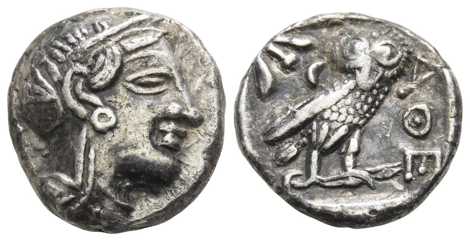 Head of Athena with profile eye to right, wearing disc earring, pearl necklace and a crested Attic helmet adorned with three olive leaves and a pi-style palmette / ΑΘΕ, owl standing to right, head facing the viewer, olive sprig with berry and crescent moon in upper left field, all within incuse square. Van Alfen pl. 11; Van Alfen, Mechanisms, Group III.A.1, Fig. 3 = Buttrey Type X. 16.85gr, 24mm, 8h.