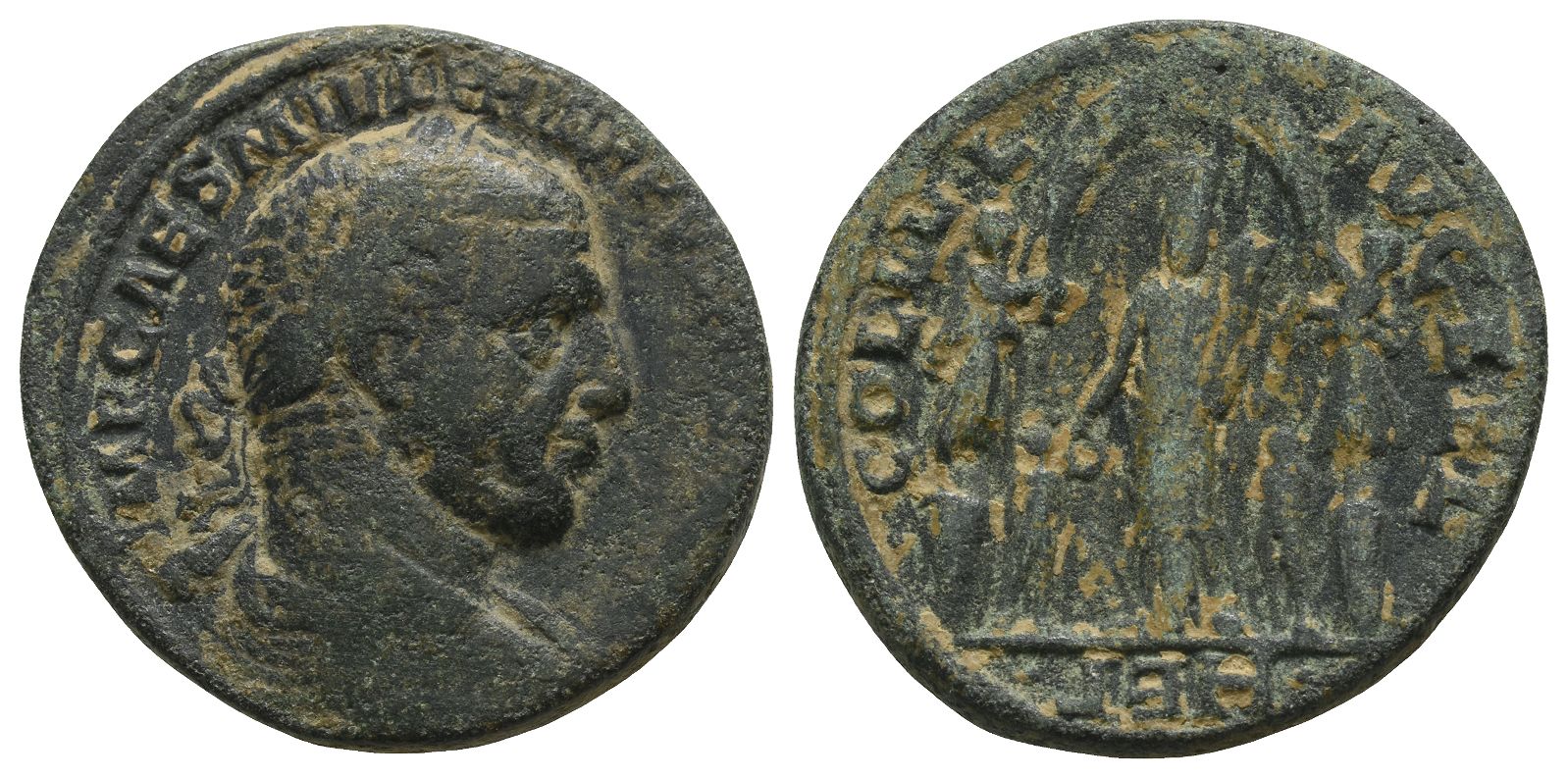 IMP CAES M IVL PHILIPPVS PIVS FEL AVG, laureate, draped and cuirassed bust to right, seen from rear / COL IVL AVG FEL HEL, Fortuna standing facing, holding rudder and cornucopia, flanked by male figures each holding torch in upraised hand; all within billowing canopy held by two female figures on pedestal. RPC VIII Online Unassigned ID 6484; Sawaya series 43, 448-87. 13.88gr, 29mm, 6h.