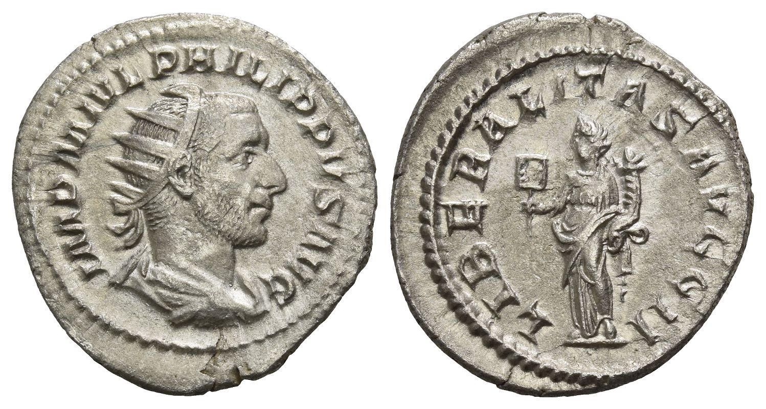 Rome mint; struck AD 244-247. IMP M IVL PHILIPPVS AVG, radiate, draped and cuirassed bust to right / LIBERALITAS AVGG II, Liberalitas standing to left, holding abacus and cornucopia. RIC IV 38b; RSC 87. 4.09gr, 24mm, 6h.