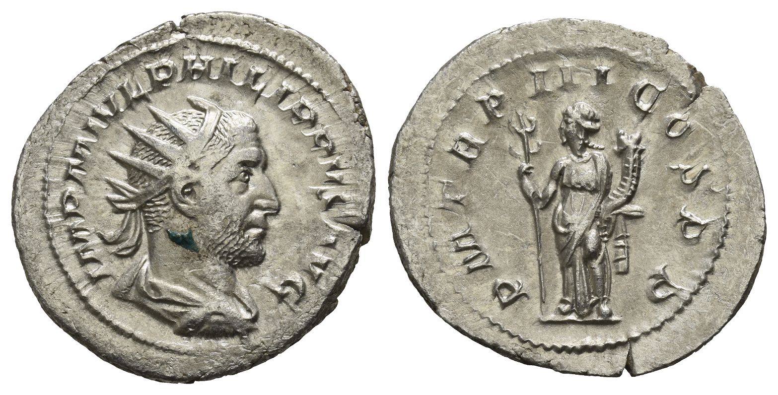 Rome mint; struck AD 246. IMP M IVL PHILIPPVS AVG, radiate, draped and cuirassed bust to right / P M TR P III COS P P, Felicitas standing facing, head to left, holding long caduceus and cornucopia. RIC IV 3; RSC 124. 4.27gr, 25mm, 7h.