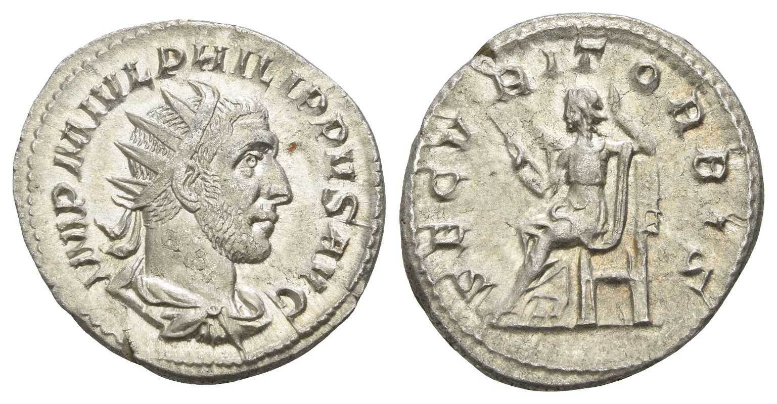 IMP M IVL PHILIPPVS AVG, radiate, draped and cuirassed bust to right / SECVRIT ORBIS, Securitas seated to left, holding sceptre and propping head on hand. RIC IV 48b; RSC 215. 4.35gr, 23mm, 6h.