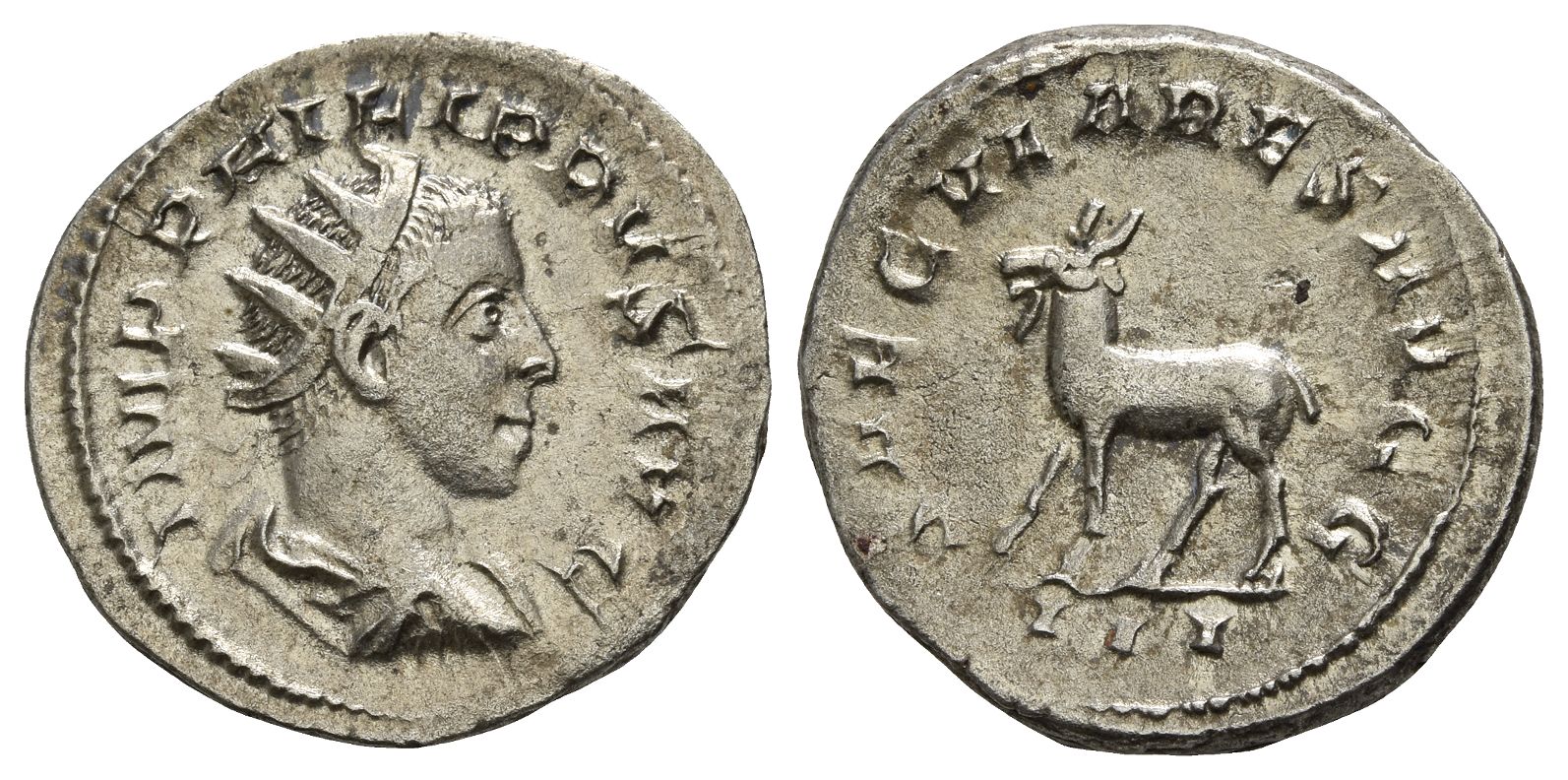 Rome mint; struck AD 248. 3rd officina. Ludi Saeculares (Secular Games) issue, commemorating the 1000th anniversary of Rome. IMP PHILIPPVS AVG, radiate, draped and cuirassed bust to right / SAECVLARES AVGG, goat standing to left; III in exergue. RIC IV 224; RSC 72. 4.05gr, 22mm, 12h.