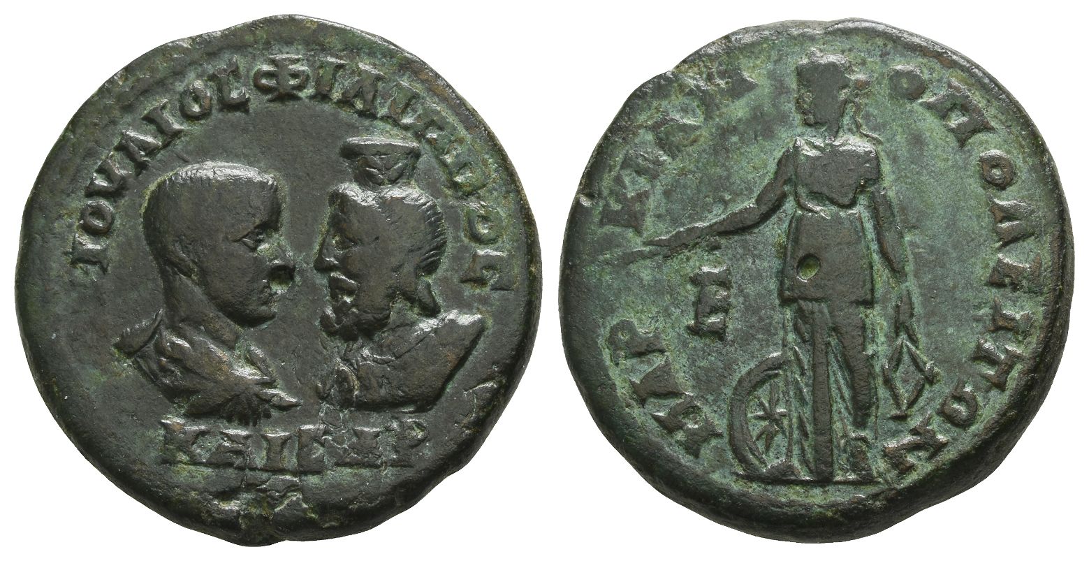 M • IOVΛIOC ΦIΛIΠΠOC KAICAP, busts of Philip II to right, bare-headed, draped and cuirassed, and Serapis to left, draped and wearing modius / MAP-KIAN-OΠOΛΕΙΤΩN, Nemesis standing facing, head to left, holding rod and ribbon, wheel to left; E (mark of value) in left field. AMNG I 1211; Varbanov 2099. 14.00gr, 27mm, 8h.