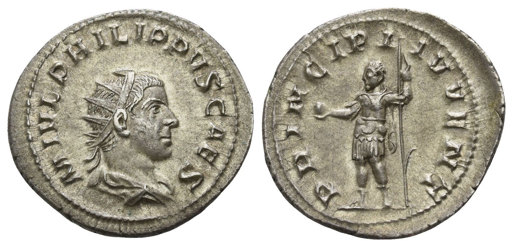 Rome mint; struck AD 246. M IVL PHILIPPVS CAES, radiate and draped bust to right / PRINCIPI IVVENT, Philip II in military dress standing to left, holding reversed spear with left hand and globe with right. RIC IV 218d var. (bust type); RSC 48 var. (same). 4.00gr, 24mm, 1h