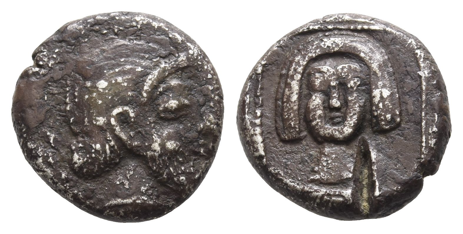 Bearded head to right / Facing female(?) head, wearing necklace, in pelletted square within incuse square. CNG, Auction 93, lot 574; otherwise unpublished. 3.30gr, 14mm, 9h.