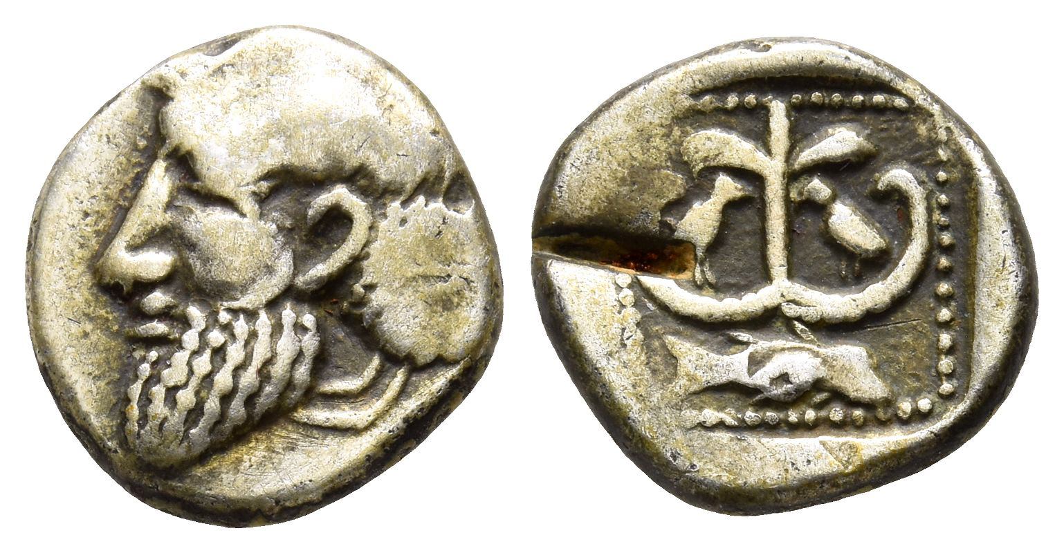 Bearded male head to left / Paradise flower or Phoenician palmette with two birds within volutes; dolphin to right below; all in dotted square within incuse square. Gitler & Tal XVII.3D; HGC 10, 604. 2.84gr, 14mm, 2h