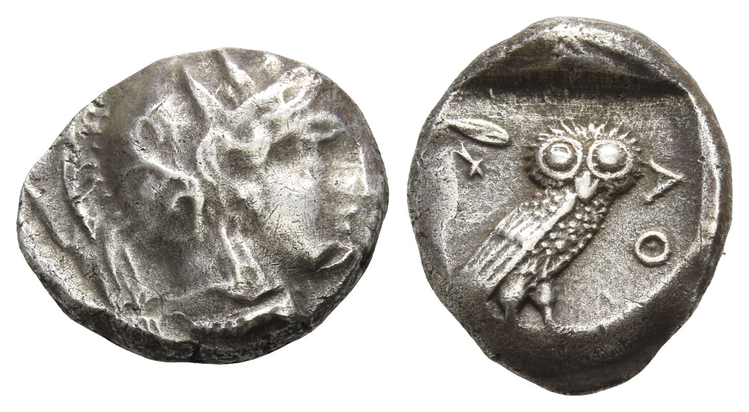 Head of Athena with profile eye to right, wearing disc earring, pearl necklace and a crested Attic helmet adorned with three olive leaves and a pi-style palmette / ΑΘ[Ε], owl standing to right, head facing the viewer, olive sprig and crescent moon in upper left field, all within incuse square. Gitler & Tal IX.1D. 4.15gr, 17mm, 9h.