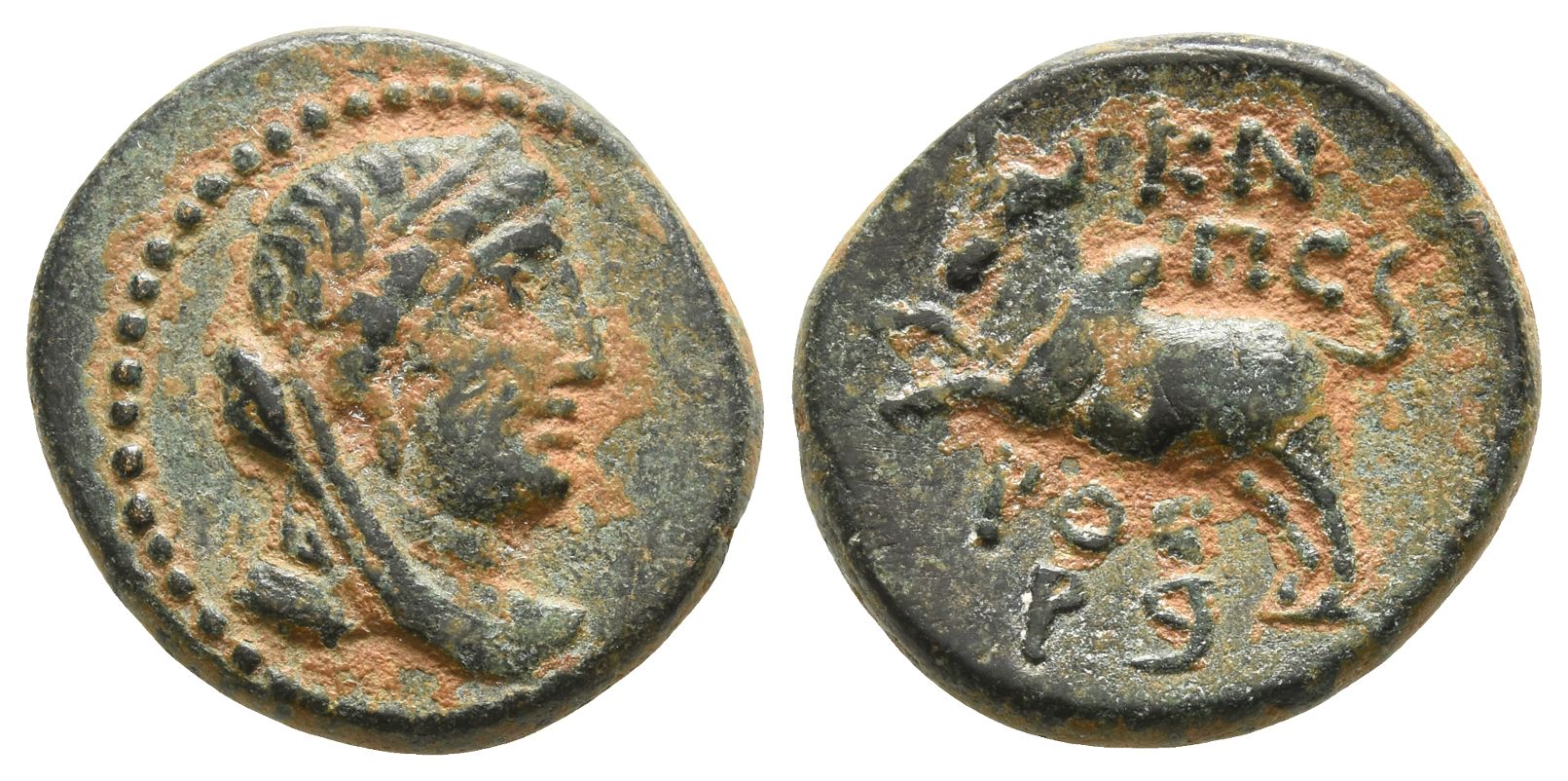 Veiled bust of Astarte to right / Humped bull running to left, KN-ΠC above; POЄ (date), P and Phoenician 'b' below. Duyrat 4481-4490; HGC 10, 80. 6.98gr, 21mm, 12h.