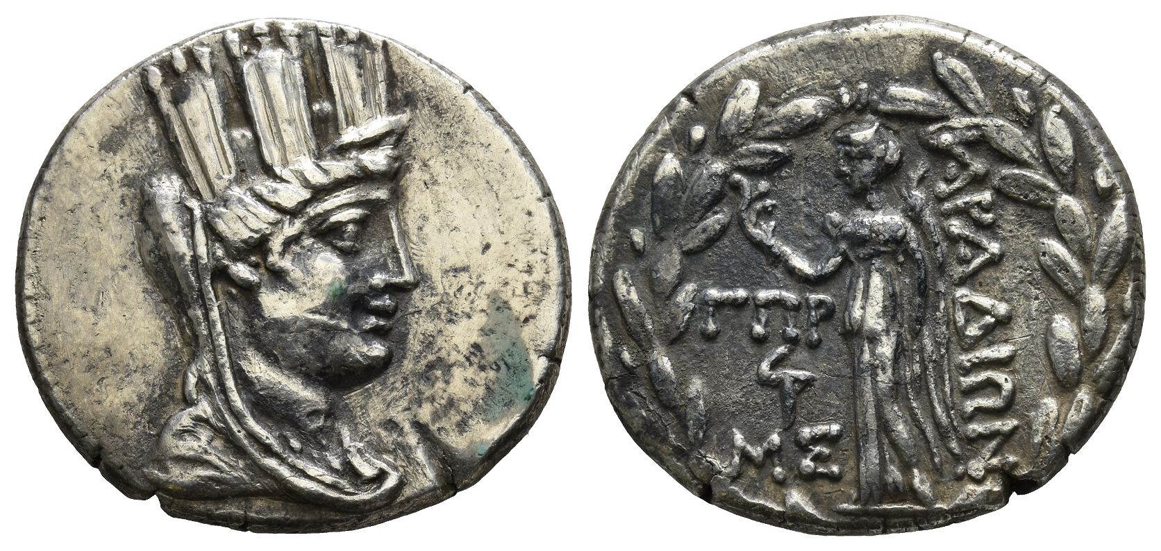 Dated CY 183 (77/6 BC). Turreted, veiled, and draped bust of Tyche to right / ΑΡΑΔΙΩΝ, Nike advancing to left, holding aphlaston and palm; ΓΠP (date), Phoenician letter 'Q', and MΣ to left; all within wreath. Duyrat 3668-78; DCA 772; HGC 10, 72. 15.17gr, 28mm, 12h.
