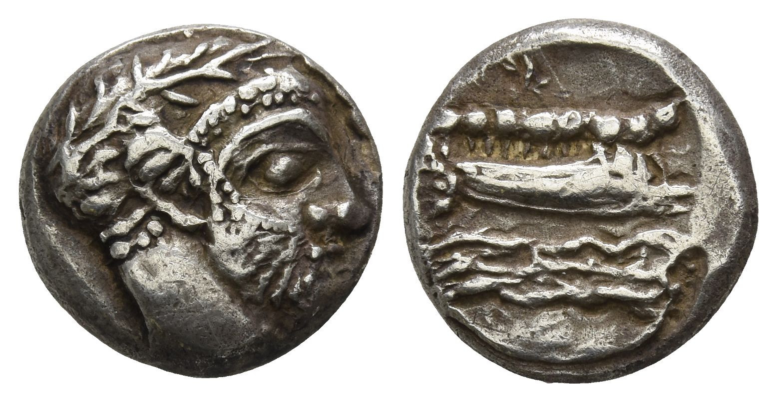 Contemporary imitation. Laureate head of Ba'al-Arwad to right / Galley to right above waves; Aramaic letter above. For prototype: cf. E&E-A Group III; cf. HGC 10, 40-1. 3.19gr, 14mm, 3h.