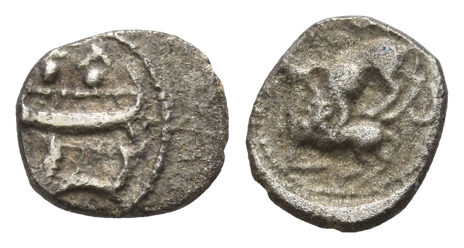 Galley to left, containing two hoplites with helmets and round shields; hippocamp to left below / Lion attacking bull to left. Cf. HGC 10, 139. 0.80gr, 10mm, 3h.