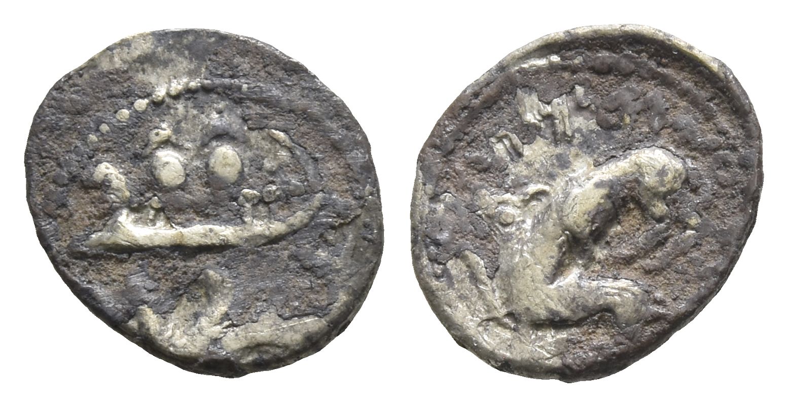 Galley to left, containing two hoplites with helmets and round shields; hippocamp to left below / Lion attacking bull to left. Cf. HGC 10, 139. 0.74gr, 12mm, 12h.