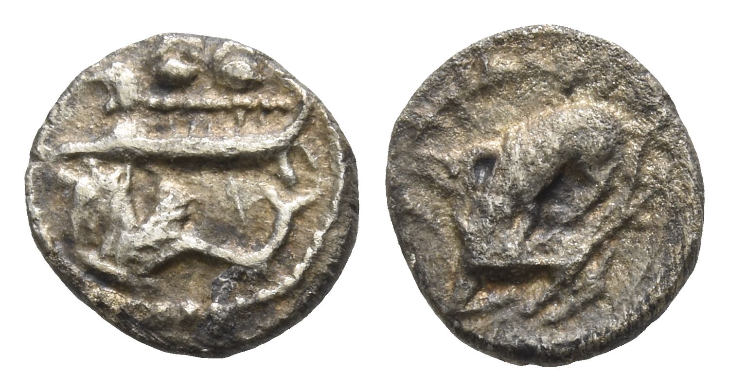 Galley to left, containing two hoplites with helmets and round shields; hippocamp to left below / Lion attacking bull to left. Cf. HGC 10, 139. 0.77gr, 10mm, 10h.