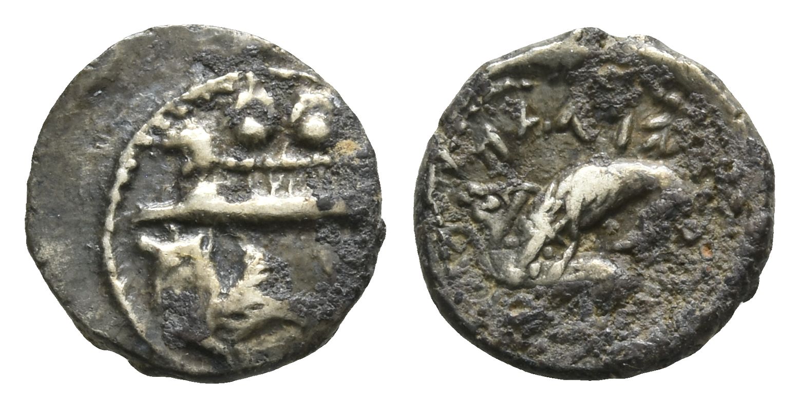 Galley to left, containing two hoplites with helmets and round shields; hippocamp to left below / Lion attacking bull to left; legend in Phoenician above. E&E-B Group IV.4.2; HGC 10, 139. 0.84gr, 11mm, 2h.