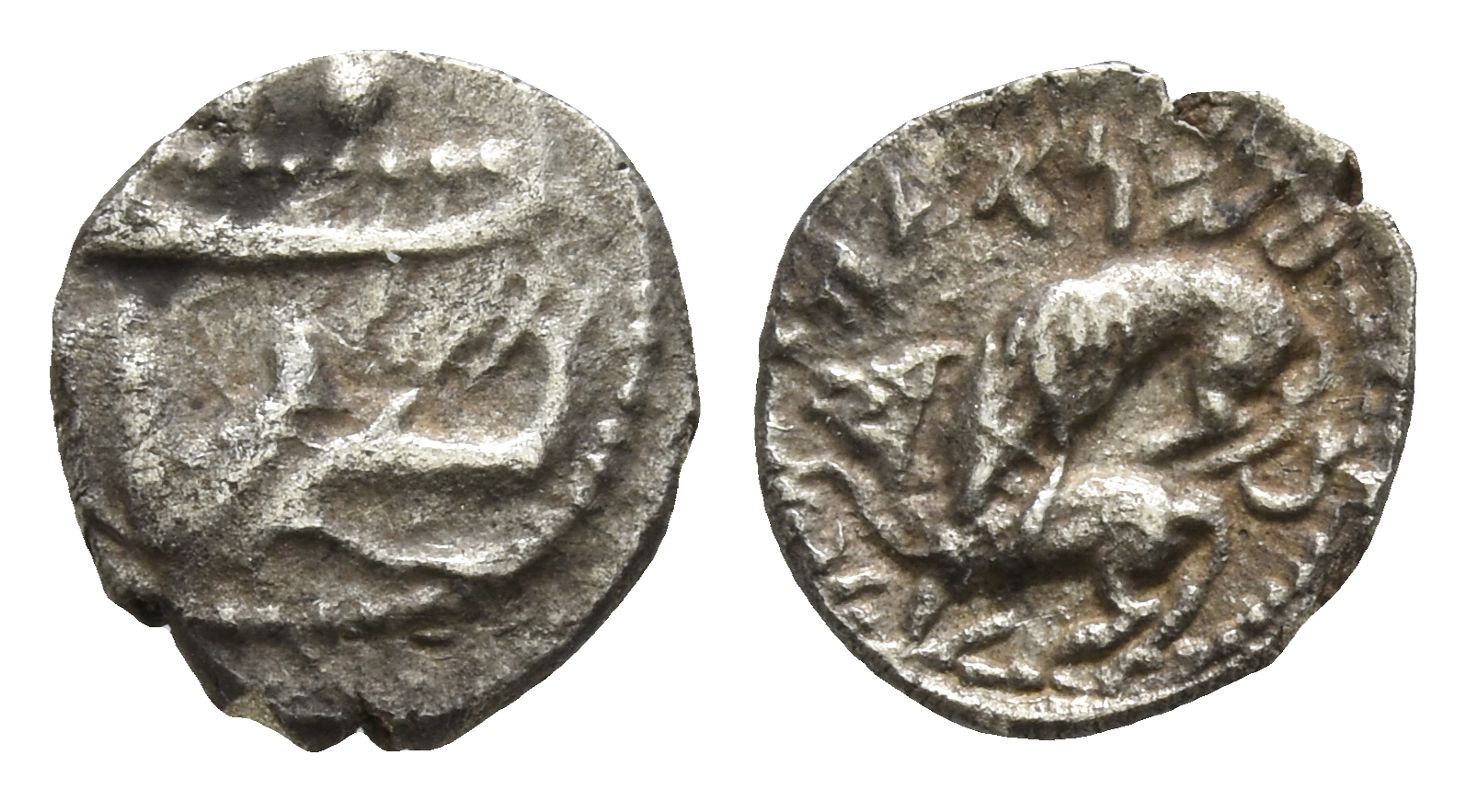 Galley to left, containing two hoplites with helmets and round shields; hippocamp to left below / Lion attacking bull to left; 'YN'L MLK GBL in Phoenician above. E&E-B Group IV.4.2; HGC 10, 139. 0.64gr, 9mm, 4h.