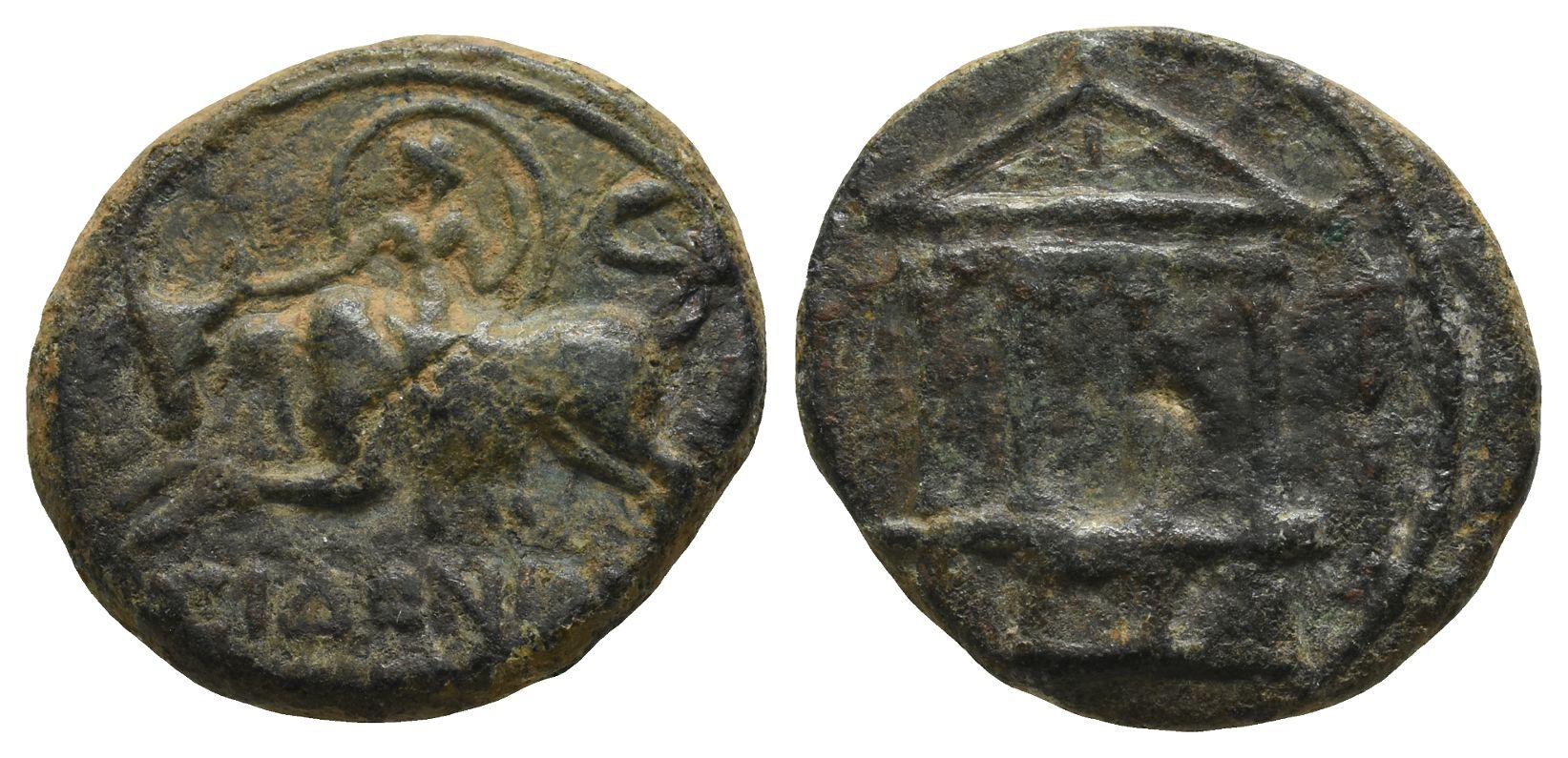 Pseudo-autonomous issue. Struck circa 10 BC-AD 18. Europa on bull to left; ΣΙΔΩΝΙΩΝ and [date] below / Altar before tetrastyle temple with tall podium. Cf. RPC I 4568-71. 6.41gr, 21mm, 12h.