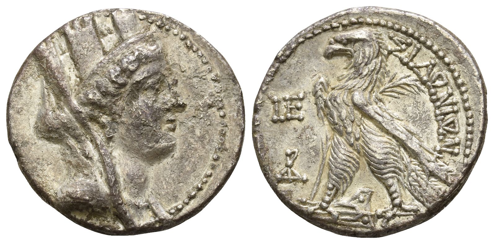 Dated CY 5 (107/6 BC). Veiled, draped, and turreted bust of Tyche to right, wearing single-pendant earring and pearl necklace / ΣIΔΩNIΩN, eagle standing to left on ram of galley; palm frond in background; to left, L E (date) above monogram of ΔΡΙ. Rouvier 1305; Prieur -; HGC 10, 275. 13.79gr, 29mm, 12h.