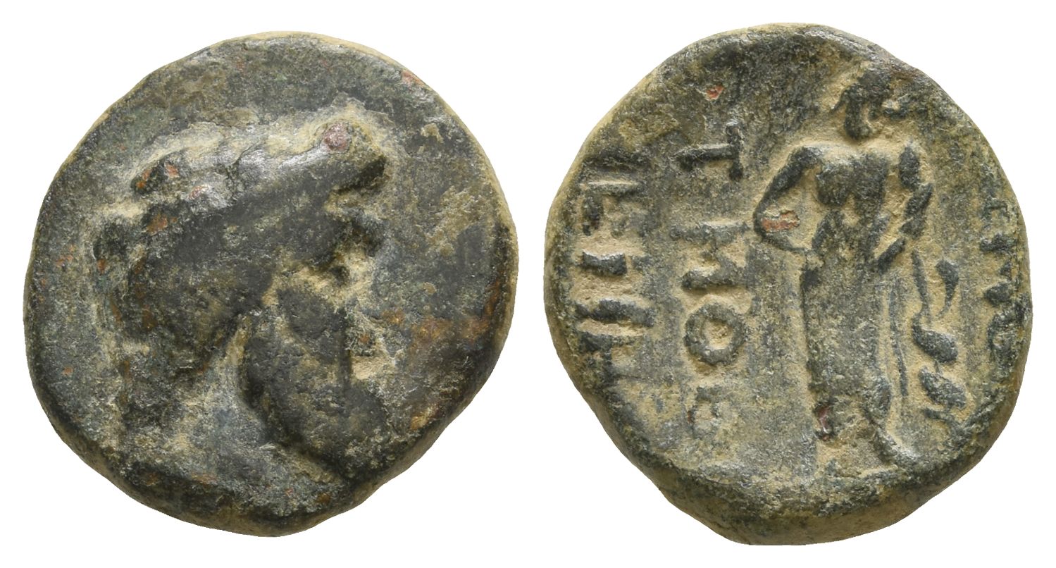 Head of Zeus to right, wearing oak wreath / [AK]MO[...] TIMOΘ[...] MENE[...], Asklepios standing facing, leaning upon serpent-entwined staff. SNG Copenhagen 12. 3.61gr, 16mm, 12h.