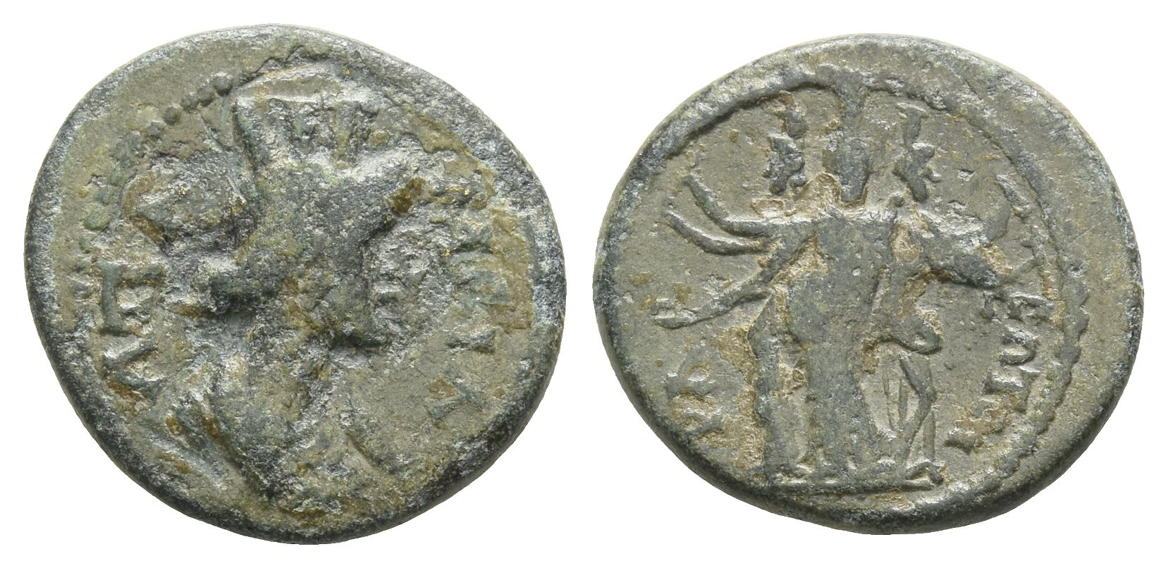 AΠA-MЄIA, turreted and draped bust of the city-goddess to right / CΩTЄI-PA, Hekate Triformis: the left and right one holding torches in each hand; the middle one patera in her right hand. BMC 110-3; SNG München 131; SNG von Aulock 3475. 2.64gr, 17mm, 5h.