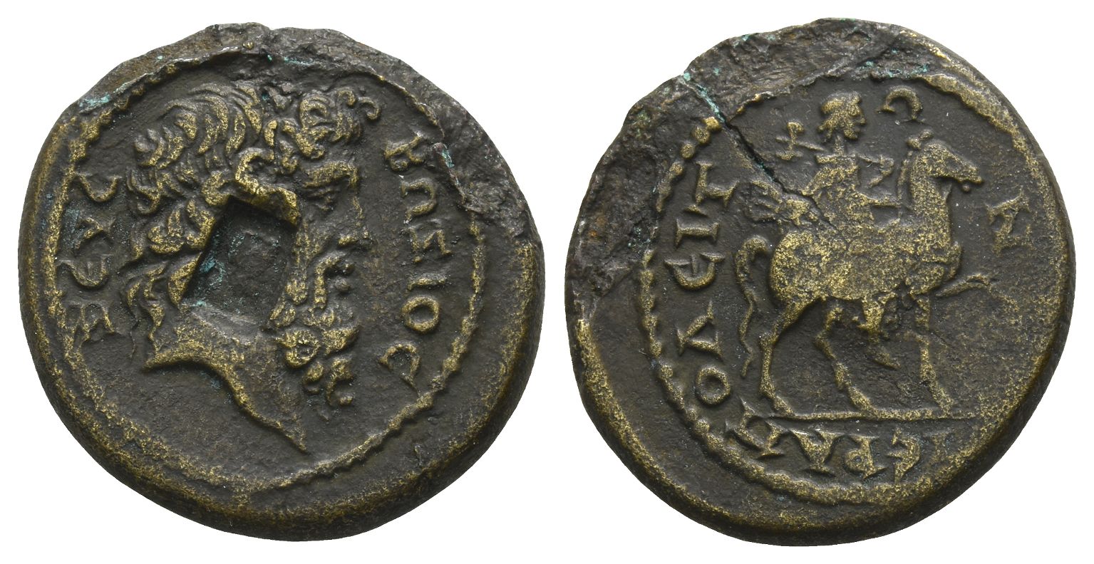 Pseudo-autonomous issue. ZЄYC BΩZIOC, bare head of Zeus Bozios to right; c/m: female(?) bust to right within rectangular incuse / IЄPAΠΟΛЄΙΤ-Ω-Ν, Apollo holding reins in right hand and bipennis over left shoulder in left, riding horse to right. RPC III, 2358C; BMC Phrygia 42; SNG Copenhagen 429; SNG Munich 223. 5.79gr, 22mm, 1h.