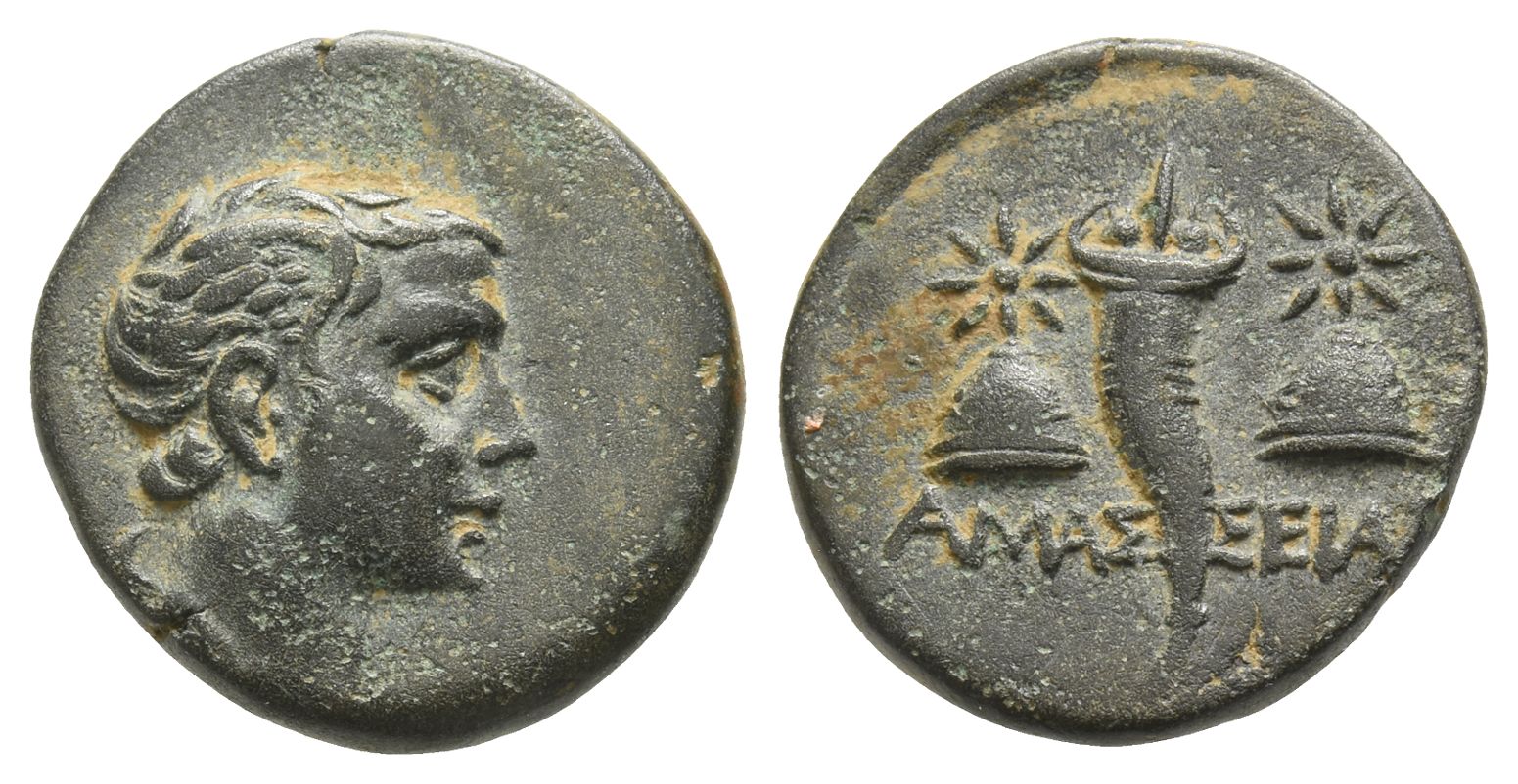 Draped male bust to right, with bare head and wings at temples / Cornucopia between pilei of the Dioscuri, each with eight-rayed star above; ΑΜΑΣ-ΣΕΙΑΣ across lower fields. SNG Stancomb 655; SNG BM Black Sea 1046-7; HGC 7, 225. 3.89gr, 18mm, 12h.
