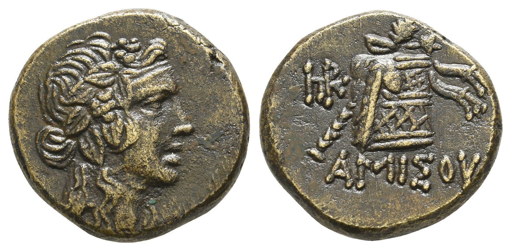 Wreathed head of Mithradates VI as young Dionysos to right / ΑΜΙΣΟΥ, panther skin and thyrsos on cista mystica; monogram of HTPK to left. Malloy 26c; HGC 7, 243. 7.96gr, 20mm, 12h.