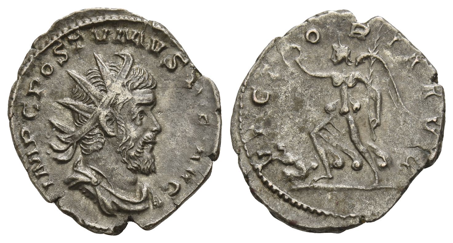 Treveri mint; struck AD 260. IMP C POSTVMVS P F AVG, radiate, draped and cuirassed bust to right / VICTORIA AVG, Victory walking to left, holding wreath and palm, treading on captive seated to left. RIC V.2 89 (Lugdunum); RSC 377a (Lugdunum). 3.34gr, 22mm, 6h.
