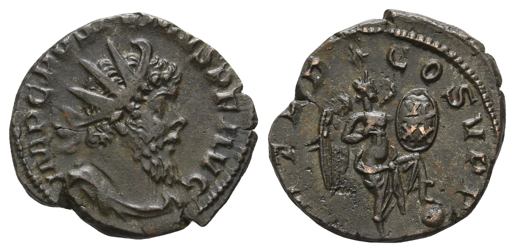 Mint II (Colonia Agrippinensis). Group II, struck AD 268-269. IMP C POSTVMVS P F AVG, radiate, draped, and cuirassed bust to right / P M TR P X COS V P P, Victory standing to right, left foot on globe, supporting shield inscribed VO XX. RIC V 295; AGK 66; Cunetio 2469. 3.03gr, 20mm, 7h.