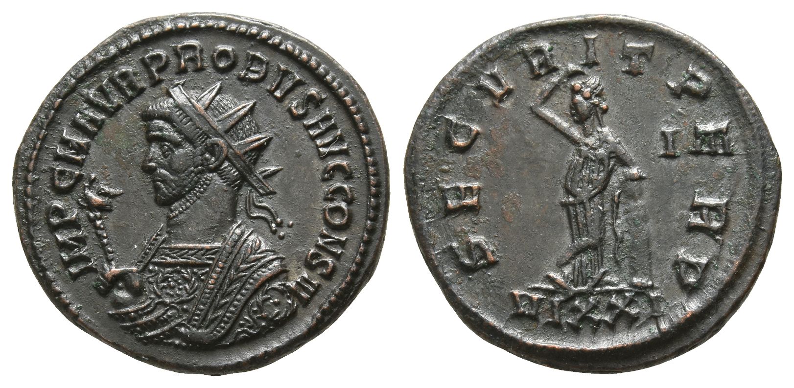 Ticinum mint; struck AD 280. 6th officina. IMP C M AVR PROBVS AVG CONS III, radiate bust to left in imperial mantle, holding sceptre surmounted by eagle / SECVRIT PERP, Securitas standing facing, head to left, legs crossed, placing her right hand on head and leaning her left elbow on column; I in right field, VIXXI in exergue. RIC V.2 528 var. (I in left field); probuscoins.fr 1966. 4.59gr, 23mm, 5h