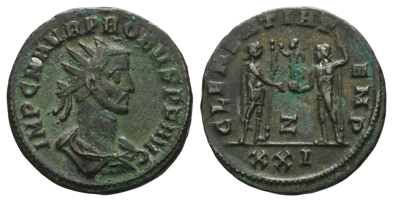Antioch mint; struck AD 276-282. 7th officina. IMP C M AVR PROBVS P F AVG, radiate, draped and cuirassed bust to right / CLEMENTIA TEMP, emperor standing to right, holding sceptre, receiving Victory set on globe from Jupiter standing to left, holding sceptre; Z between, XXI in exergue. RIC V.2 922. 3.71gr, 21mm, 12h.