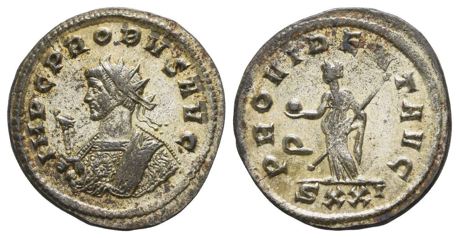 Ticinum mint; struck AD 281. 4th officina. IMP C PROBVS AVG, radiate and mantled bust to left, holding eagle-tipped sceptre / PROVIDENT AVG, Providentia standing to left, holding globe and sceptre; Q in left field, SXXI in exergue. RIC V.2 490; probuscoins.fr 303. 3.81gr, 24mm, 6h.