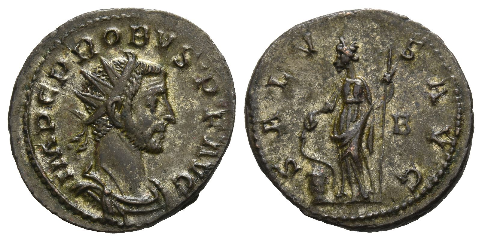 Lugdunum mint; struck January-August AD 282. 2nd officina. IMP C PROBVS P F AVG, radiate, draped, and cuirassed bust to right / SALV-S AVG, Salus standing to left, holding sceptre and feeding from patera snake coiled around and rising from altar to left; B to right. RIC V 124; Lyon 393. 3.67gr, 23mm, 12h.