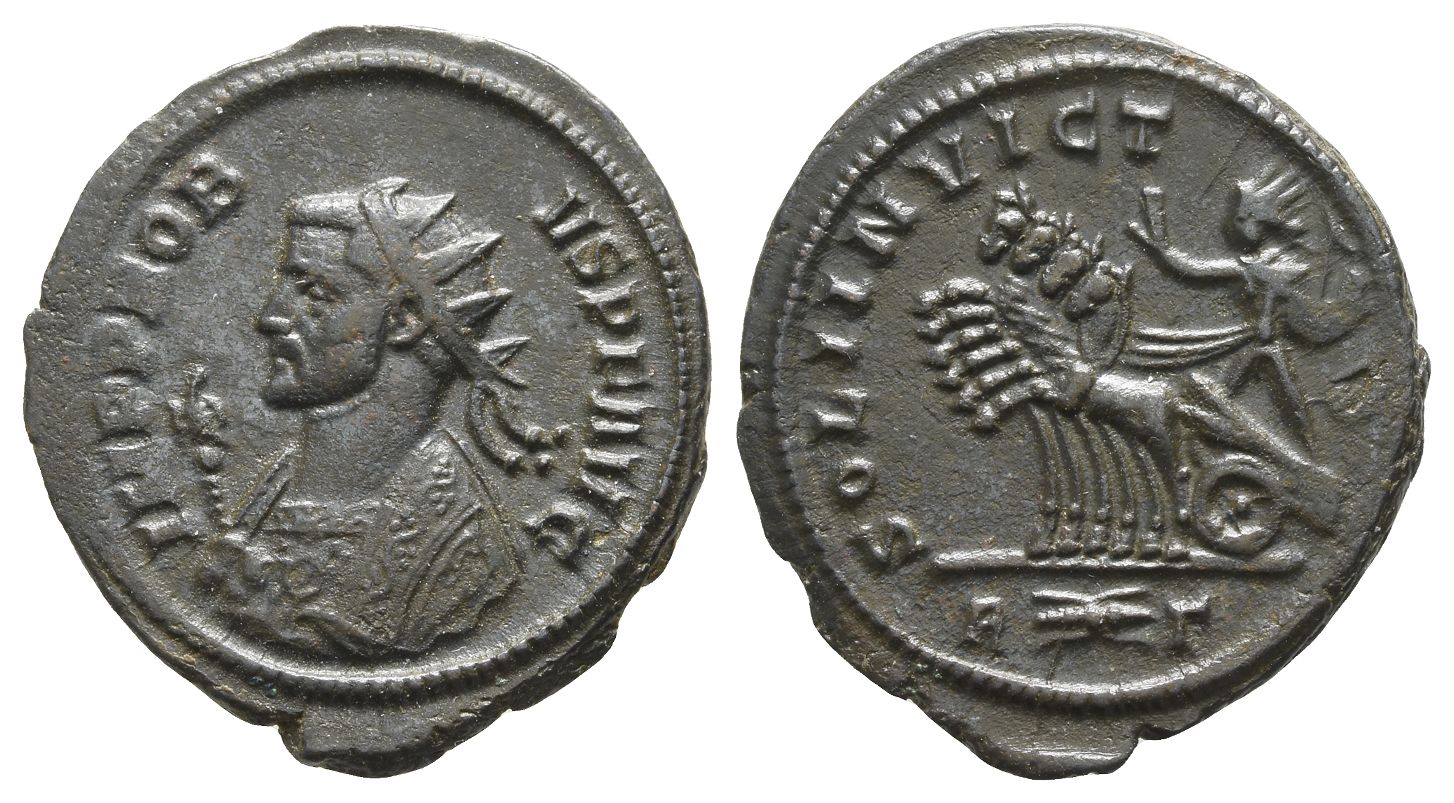 IMP PROBVS P F AVG, radiate and mantled bust to left, holding eagle-tipped sceptre / SOLI INVICTO, Sol driving galloping quadriga to left, holding globe and whip and raising hand; R(thunderbolt)Γ in exergue. RIC V.2 200; Cohen 648. 3.78gr, 23mm, 12h.