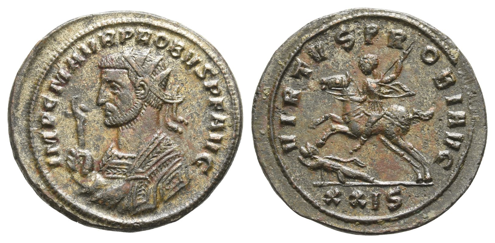 IMP C M AVR PROBVS P F AVG, radiate and mantled bust left, holding eagle-tipped sceptre / VIRTVS PROBI AVG, XXIS, Probus on horse galloping left, preparing to hurl spear at fallen enemy to lower left. RIC 818. 5.08gr, 24mm, 6h.