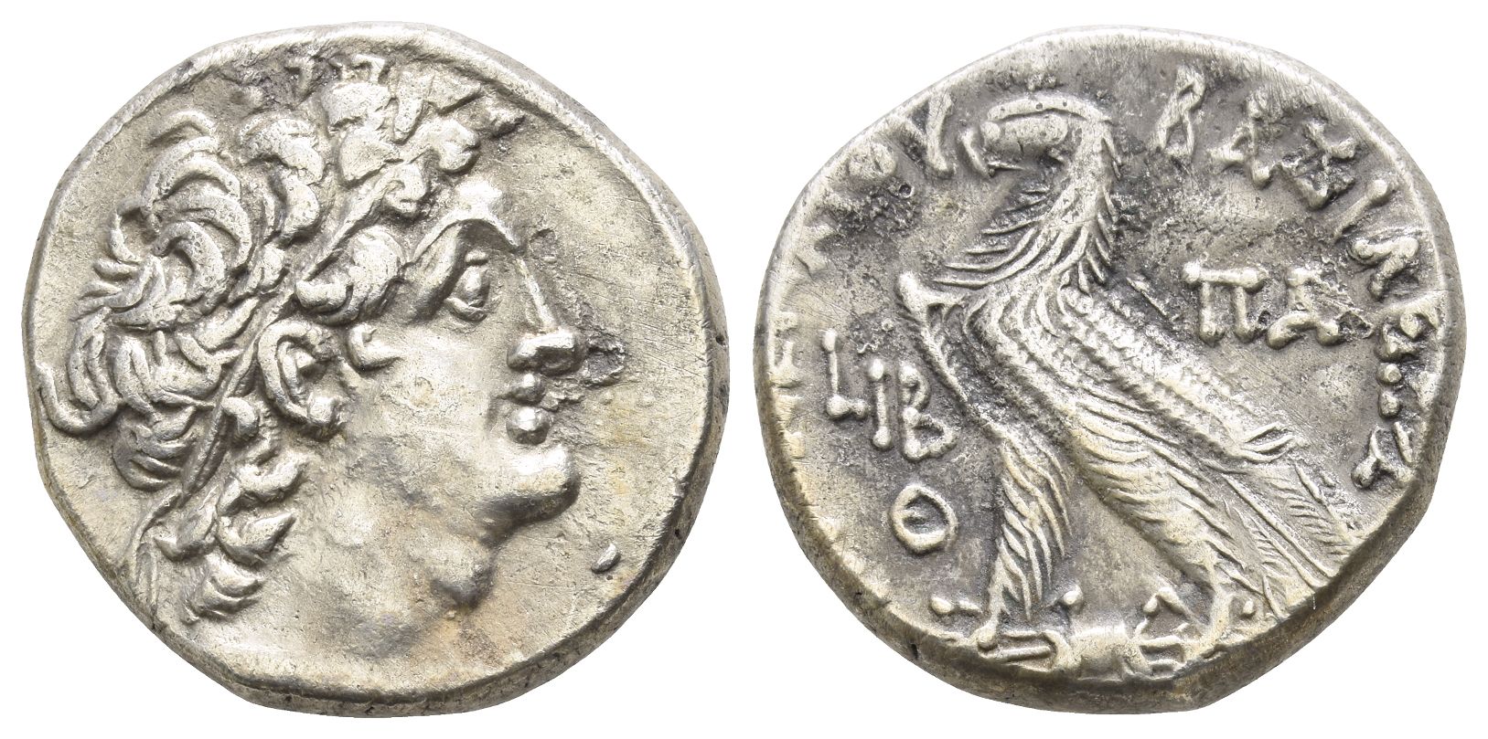 Diademed head of Ptolemy I to right, wearing aegis around neck / ΠΤΟΛΕΜΑΙΟΥ ΒΑΣΙΛΕΩΣ, eagle with closed wings standing to left on thunderbolt; to left, L IB (Kleopatra's RY date) above Θ (Ptolemy's RY date); ΠΑ to right. CPE 1518; Svoronos 1728; SNG Copenhagen 359; DCA2 1147. 13.48gr, 25mm, 12h.
