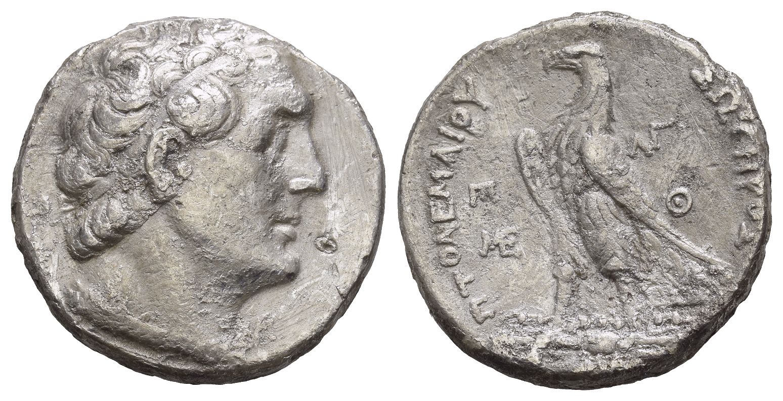 Diademed head of Ptolemy I to right, wearing aegis around neck / ΠΤΟΛΕΜΑΙΟΥ ΣΩΤΗΡΟΣ, eagle standing to left on thunderbolt; to left, monogram of ΠT (mint) above monogram of ME; to right, ΛΓ (date) above Θ. CPE 650; Svoronos 777; SNG Copenhagen 472. 13.27gr, 25mm, 12h.