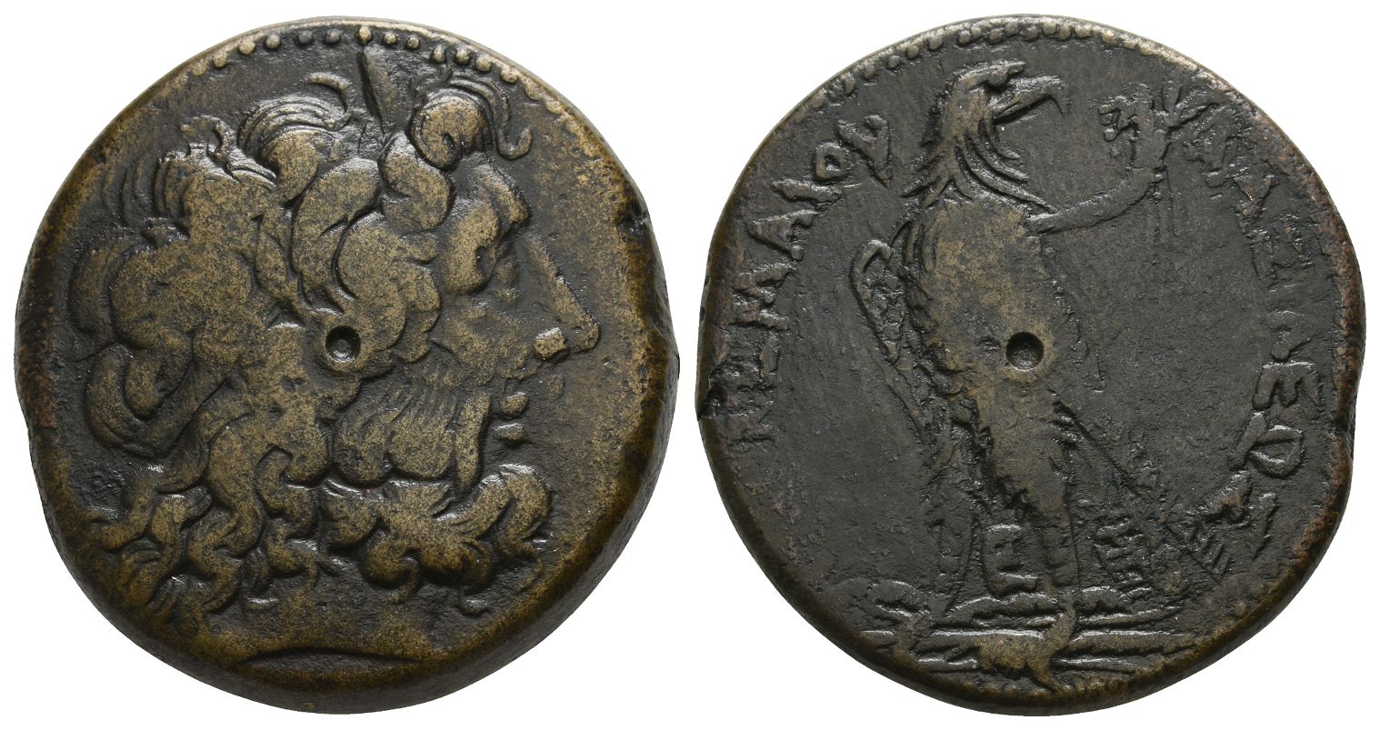 Alexandria mint. Series 4B. Laureate head of Zeus-Ammon to right, wearing taenia with basileion / [ΠΤΟΛ]ΕΜΑΙΟΥ ΒΑΣΙΛΕΩΣ, eagle with closed wings standing to left on thunderbolt, head to right; cornucopia bound with royal diadem across shoulders behind, E between legs. CPE B366; Köln 91; SNG Copenhagen 224-226 (Ptolemy IV); Svoronos 974. 44.60gr, 38mm, 12h.
