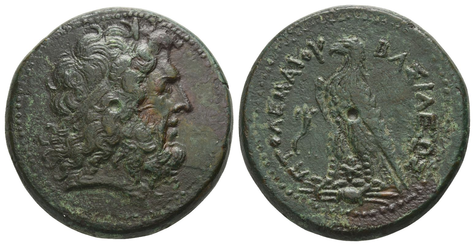 Alexandria mint. Series 5B. Horned head of Zeus-Ammon to right, wearing taenia with basileion / ΒΑΣΙΛΕΩΣ ΠΤΟΛΕΜΑΙΟΥ, eagle with closed wings standing to left on thunderbolt; filleted cornucopia to left, monogram of XP between legs. CPE B396; Svoronos 965; SNG Copenhagen 173-5. 33.81gr, 36mm, 12h