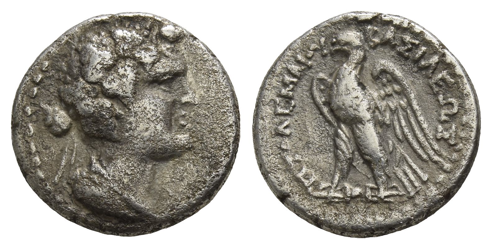 Paphos mint. Draped bust of Dionysos to right, wearing ivy wreath; thyrsus over shoulder / ΠΤΟΛΕΜΑΙΟΥ ΒΑΣΙΛΕΩΣ, eagle standing to left on thunderbolt. Svoronos 1794; Olivier 2652ß65; SNG Copenhagen 639 & Supp. 1321-3. 3.22gr, 15mm, 12h.