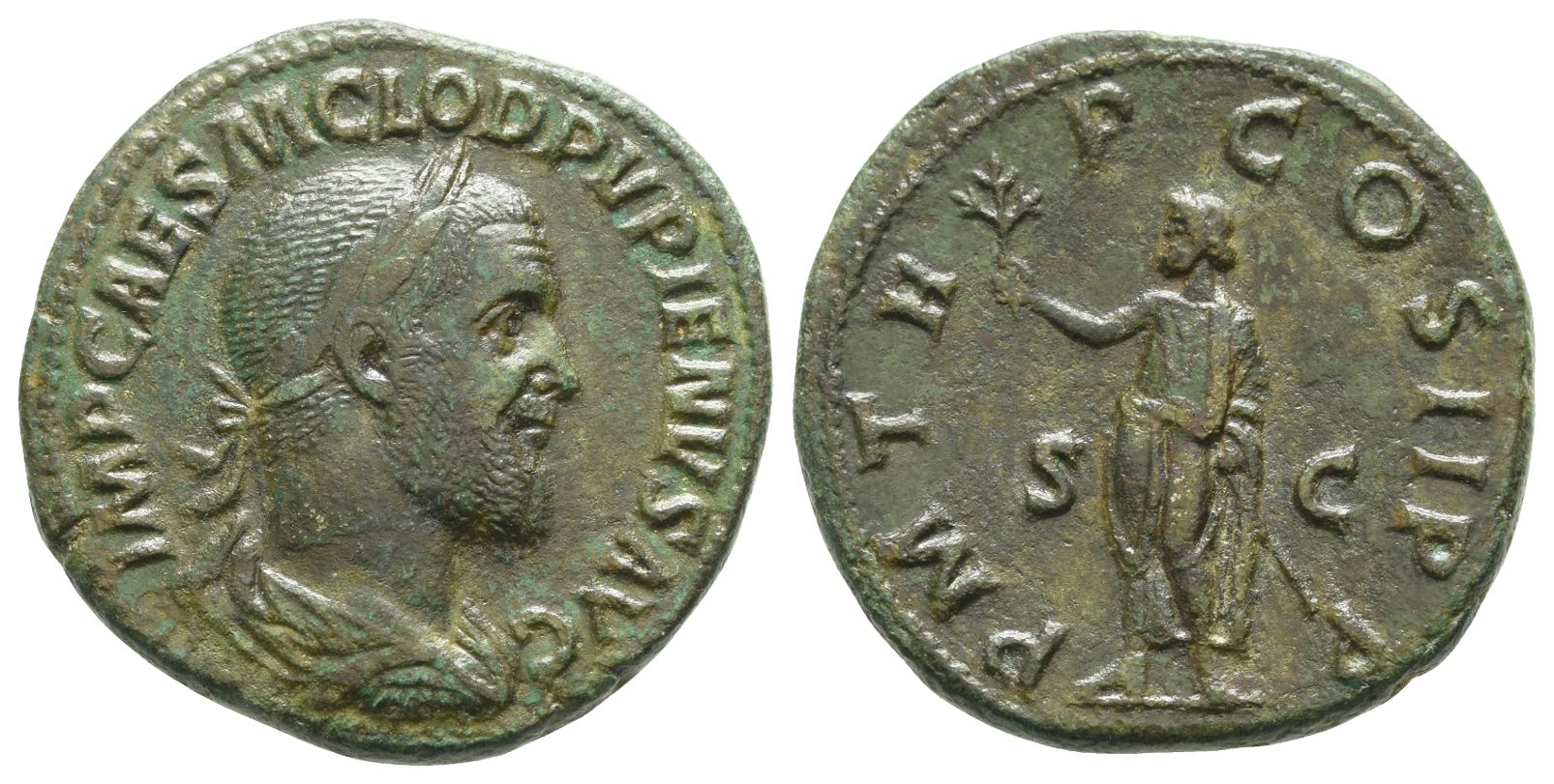 IMP CAES M CLOD PVPIENVS AVG, laureate, draped and cuirassed bust to right / P M TR P COS II P P, emperor standing to left, holding branch and parazonium; S C across fields. RIC IV 15; Cohen 30; BMCRE 51. 17.61gr, 30mm, 12h.