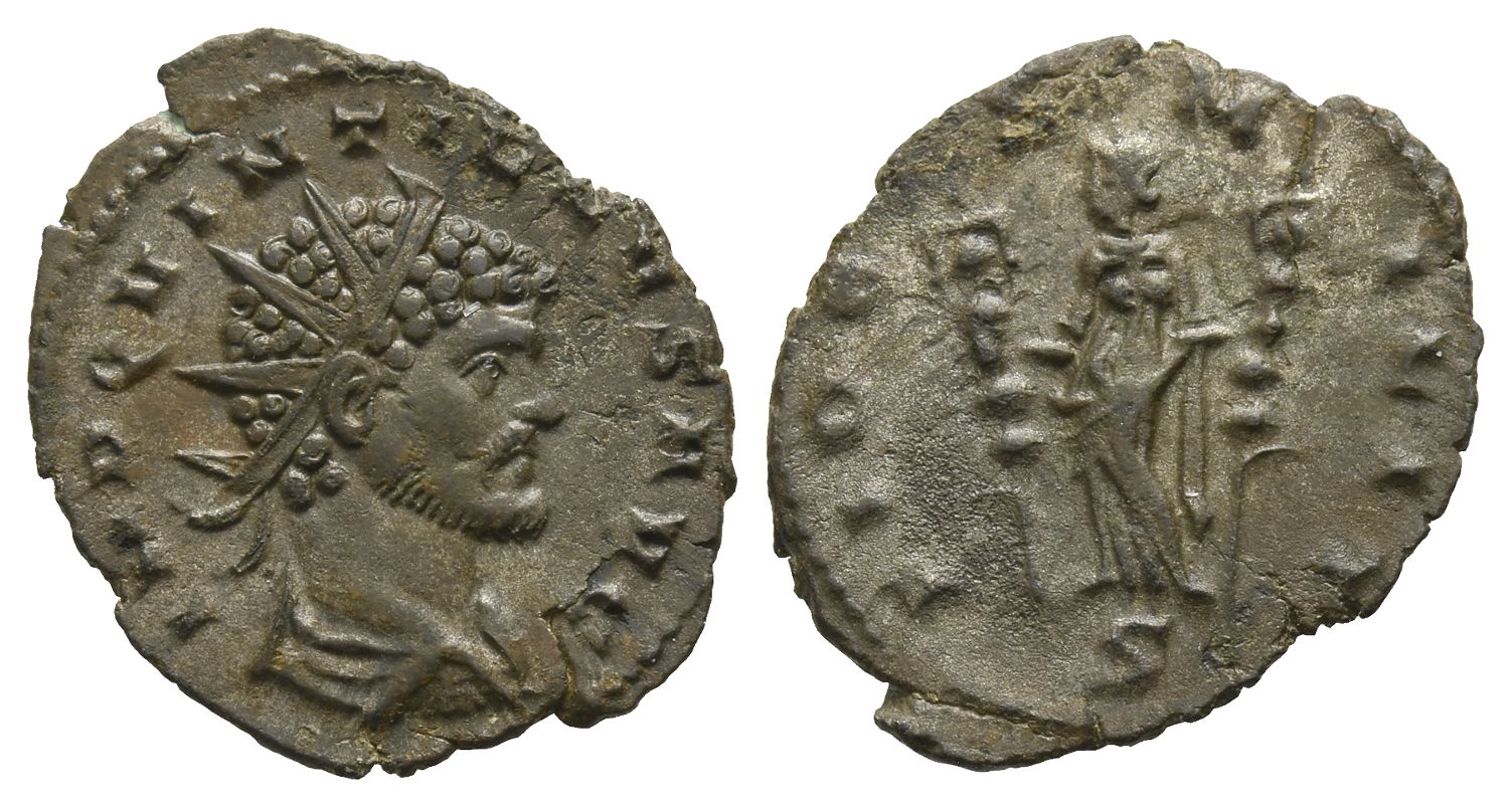 Mediolanum mint; struck AD 270. 2nd officina. IMP QVINTILLVS AVG, radiate, draped and cuirassed bust to right / FIDES MILIT, Fides standing to left, holding two standards, S in exergue. RIC V.1 52 var. (bust type); MER-RIC 1116 (temporary). 1.96gr, 22mm, 6h.