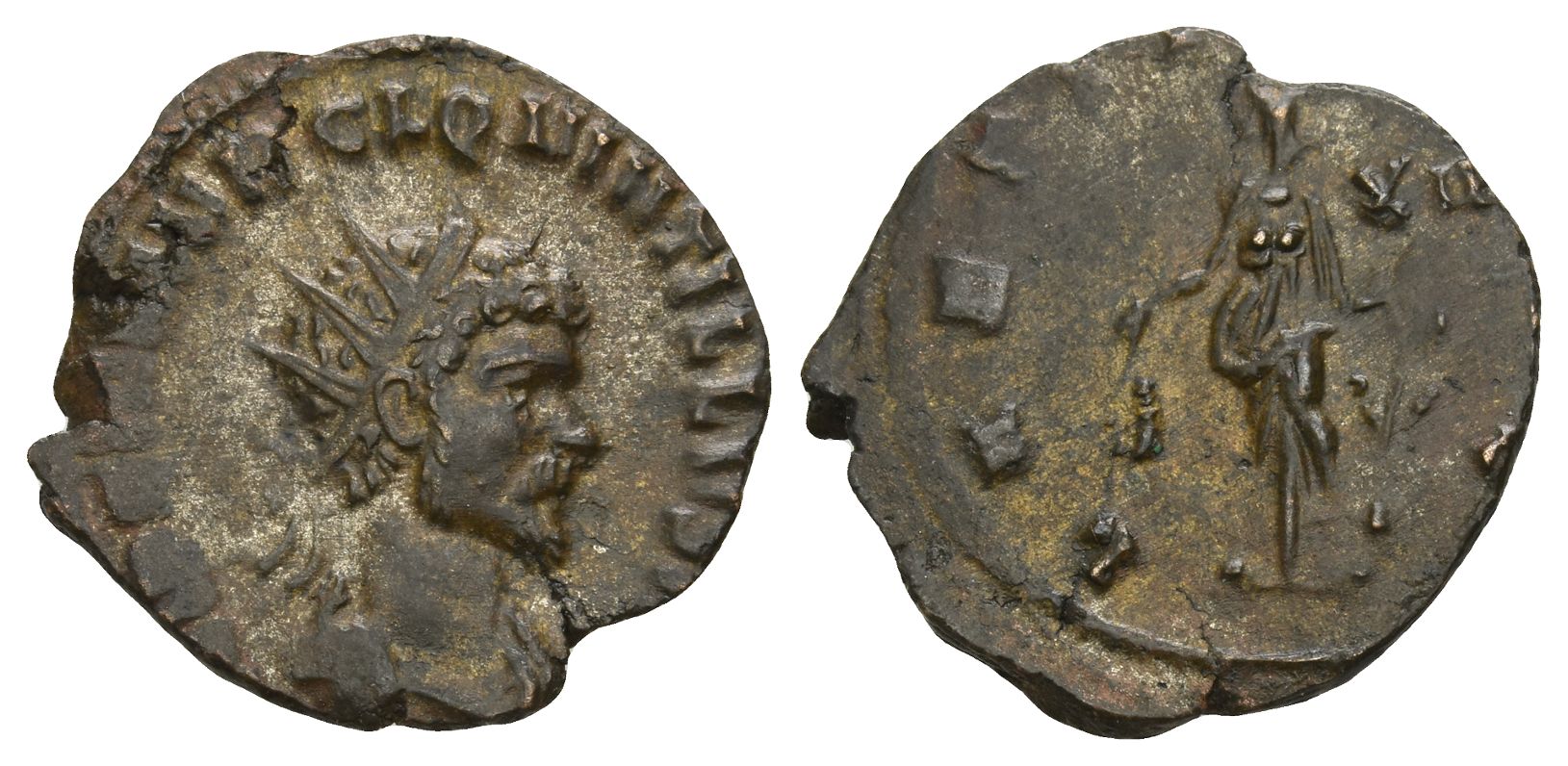 Rome mint. 12th officina. IMP C M AVR CL QVINTILLVS [AVG], radiate, draped and cuirassed(?) bust to right / LAETI[TIA AVG], Laetitia standing to left, holding wreath and anchor set on globe; XII in right field. Cf. RIC V.1 22; cf. MER-RIC 1202 (temporary). 2.43gr, 20mm, 7h.